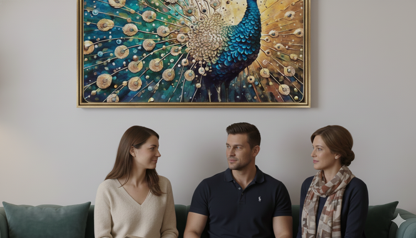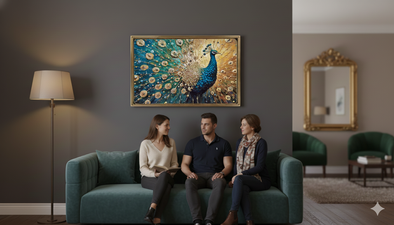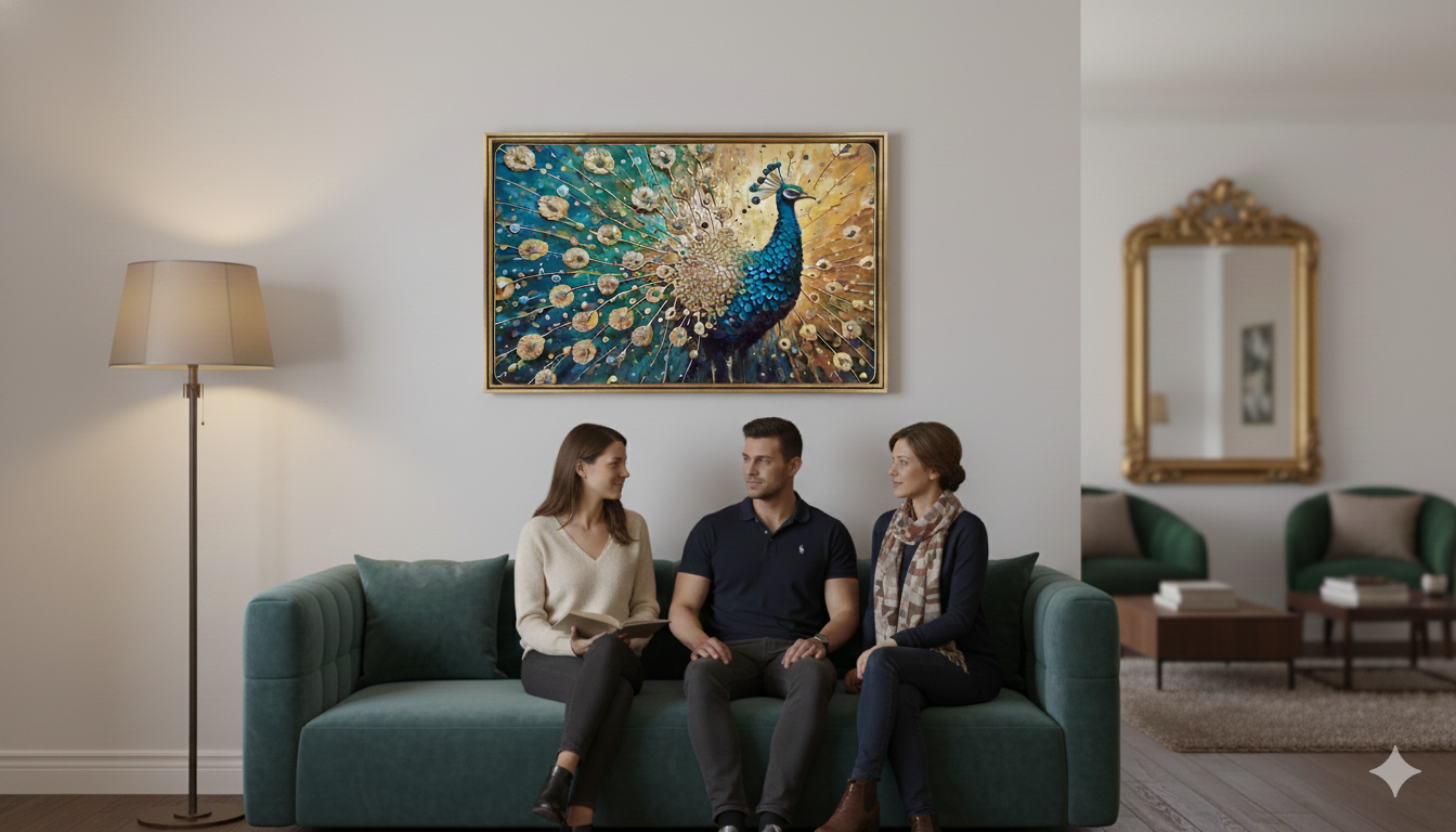The setting is bright, suggesting the frame is hung in a well-lit living area or room with a pure white wall, which further enhances the visual impact and clarity of the artwork. This presentation suggests the piece is valued for its spiritual significance and clean, aesthetic contribution to the room's decor.