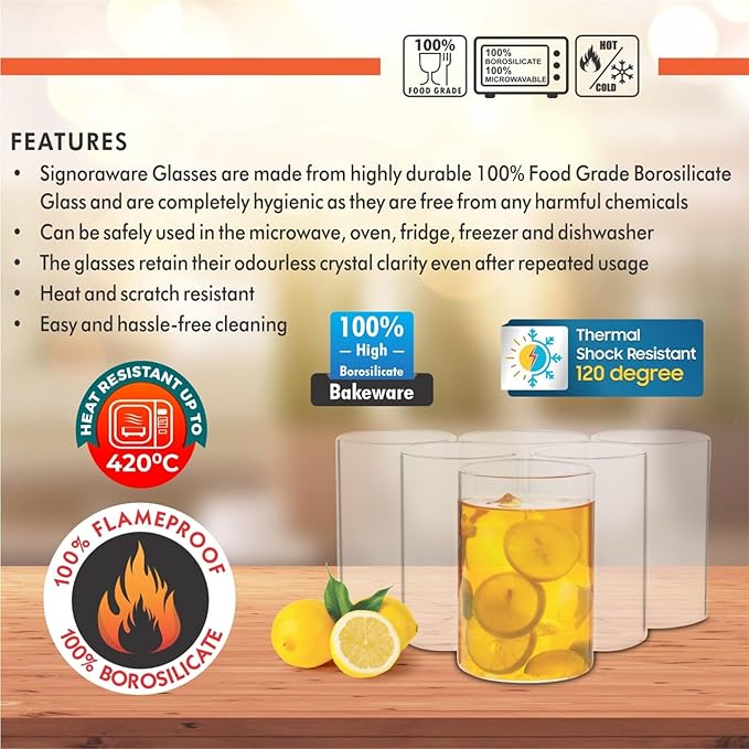 Signoraware's Ilusion Glass (Set of 6) is specially designed keeping in mind your taste for the best. The glasses are made from durable and 100% food grade Borosilicate Glass. They are incredibly versatile and look amazing. They are heat and scratch resistant and can safely be used in a microwave or freezer.