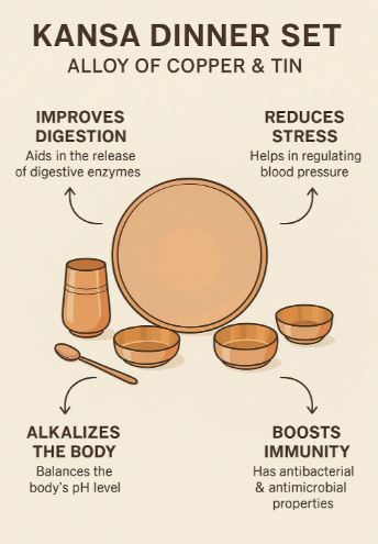 Along with these uses, there has been the tradition of Ayurvedic physicians recommending the use of Kansa on the feet for their clients. Traditional value Kansa usage dates back to thousands of years and have been an integral part of many households till recent years. Kansa basana as it is known traditionally was used in every household across and most parts of western india Ayurveda has documented immense health benefits of using kansa vessel in day-to-day food preparation and serving.
