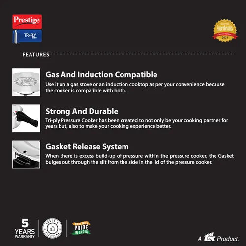 Prestige Svachh Triply Outer Lid Pressure Cooker with Unique Deep Lid for Spillage Control, 3.5 Litre, Silver
