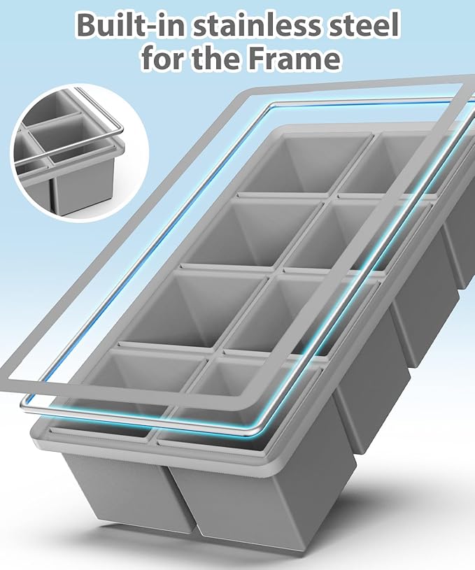 - STURDY & LEAKPROOF STAINLESS - REINFORCED DESIGN:Our high-quality silicone ice cube molds feature an upgraded and stable design. With a stainless steel interior and a sealed lid, they remain stable and won't leak when you pour water into them. They won't tip over during the freezing process either. Whether you're making ice cubes, ice soup, or freezing leftovers, there will be no leakage at all